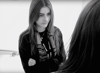 During our dialect, we used two over the shoulder shots. The first over the shoulder shot is Elise spitefully saying to Wai "Watch where you're going, loser". This shot is effective as it is commonly used when displaying two characters having a conversation. Here, the audience feels as if they are Wai being spoken to by Elise.